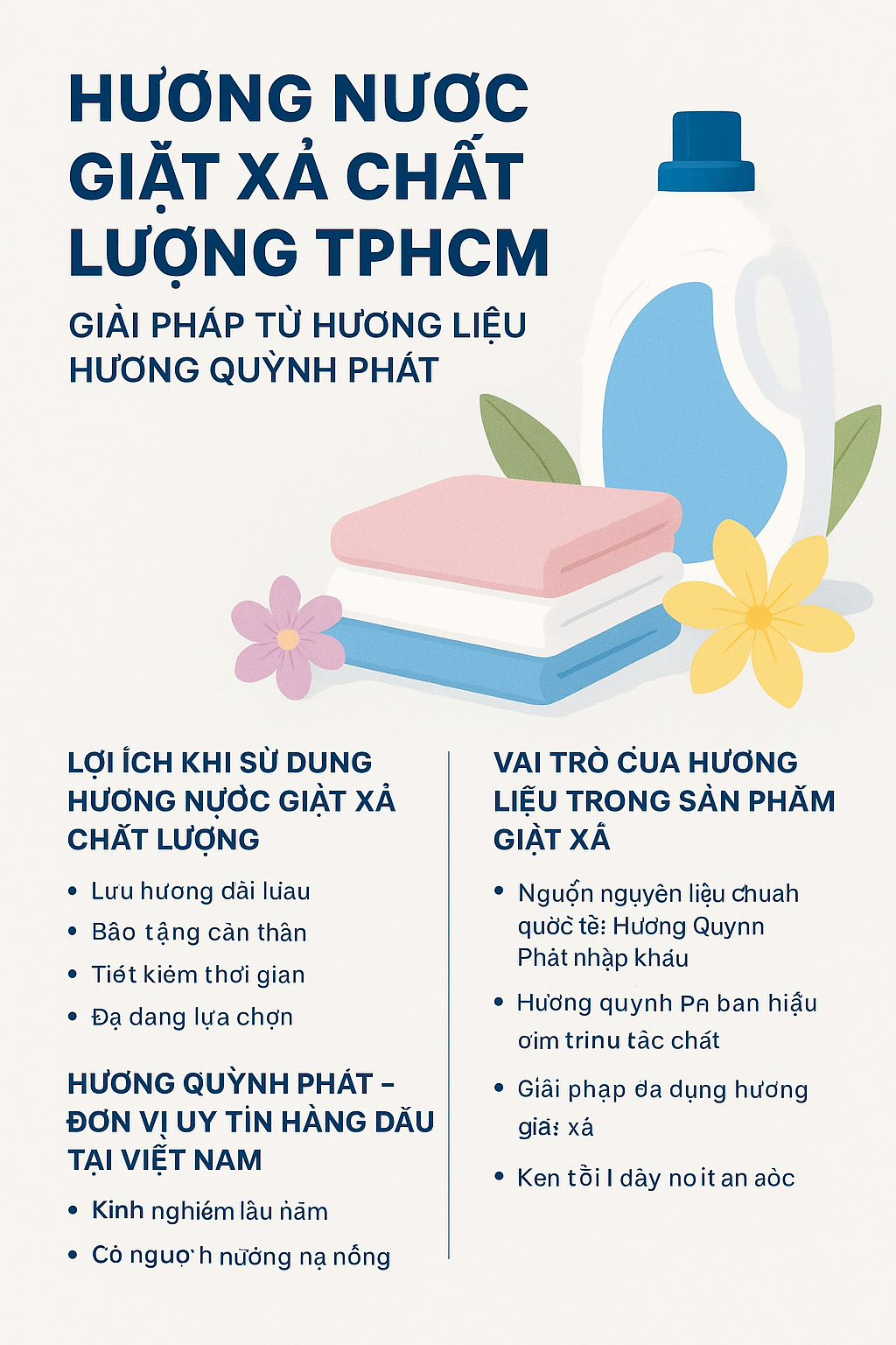 Nếu bạn đang tìm kiếm hương nước giặt xả chất lượng TPHCM, hãy ưu tiên những sản phẩm sử dụng hương liệu đến từ Công ty Hương Liệu Hương Quỳnh Phát – đơn vị uy tín hàng đầu Việt Nam. Đây chính là lựa chọn hoàn hảo để mang đến trải nghiệm giặt xả khác biệt, giúp quần áo luôn sạch sẽ, thơm ngát và an toàn cho cả gia đình.